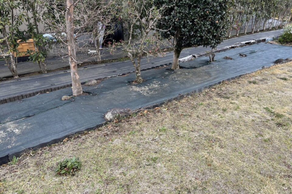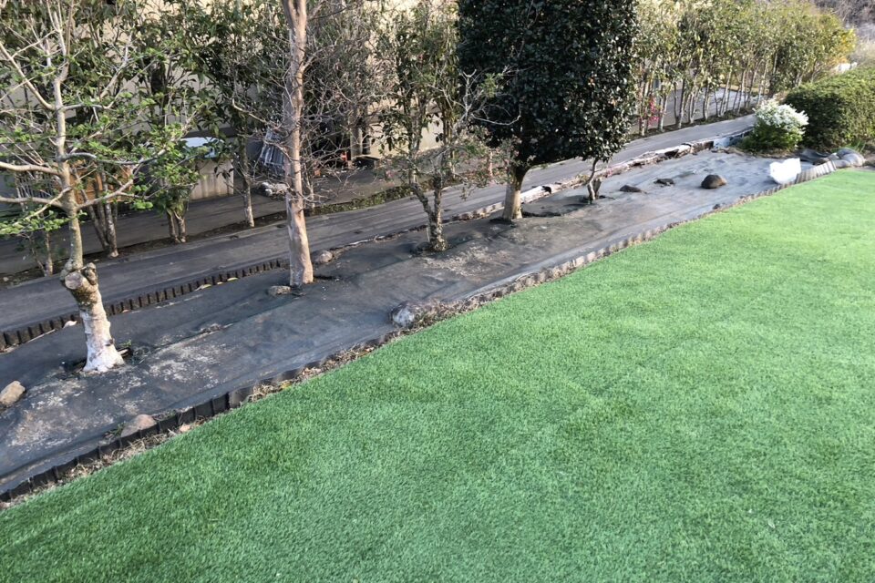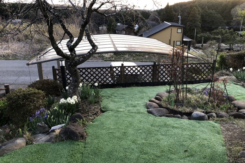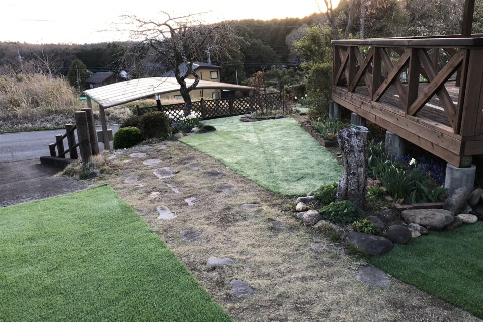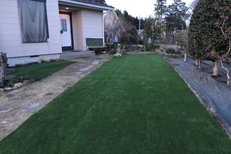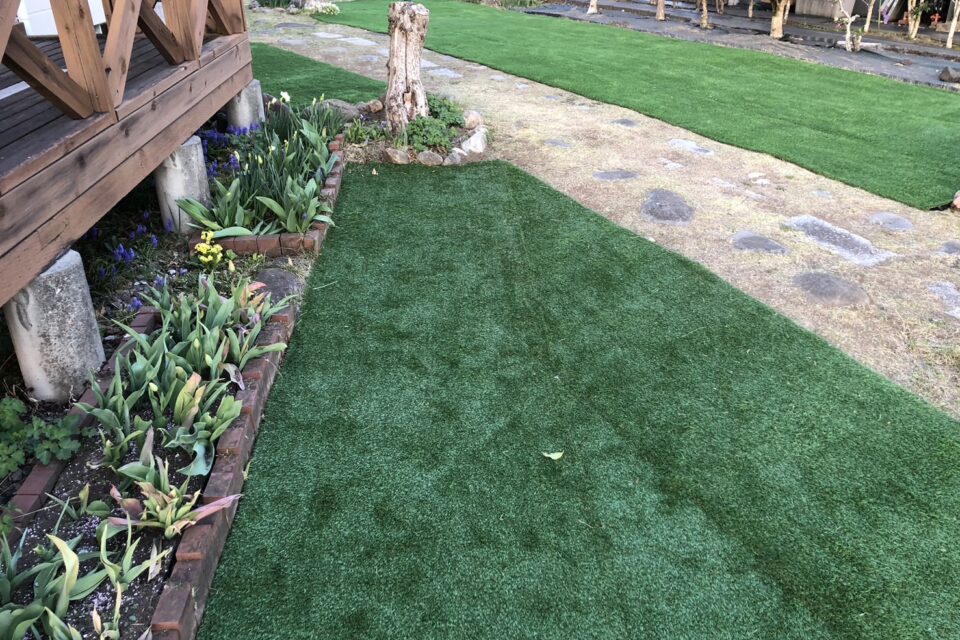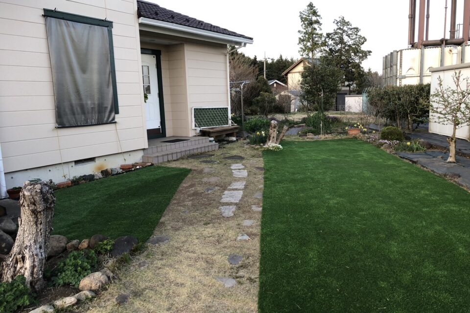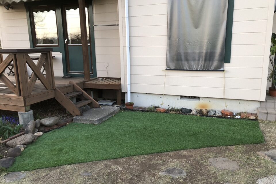 Z様より、お庭に人工芝を敷きたいとのご依頼を頂きました。担当が現場に訪問し、設置面積等の寸法を把握したうえで、作業を進行させていただきました!写真のように広範囲に設置をするのは、大変な作業ですよね..。1枚1枚丁寧に設置し、お庭の地面が綺麗な緑色でいっぱいになりました!