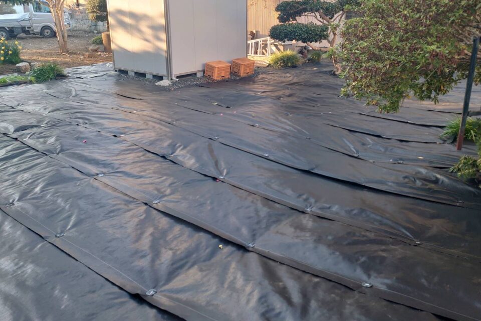 A様より、土地に防草シートを敷きたいとのご依頼を頂きました。担当が現場に訪問させていただき、設置範囲などを確認した上で作業を進行しました!防草シートを設置することで、雑草などに悩まされることもなくなります!